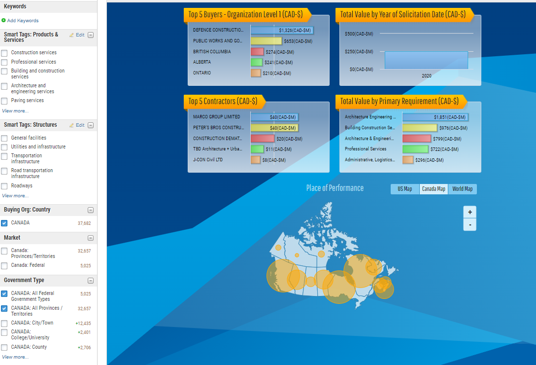 The Canadian government market is healthy, with the top Canadian contracting opportunities for 2022-23 valued at over $2.3B (CAD), or approx. $1.8B (USD)